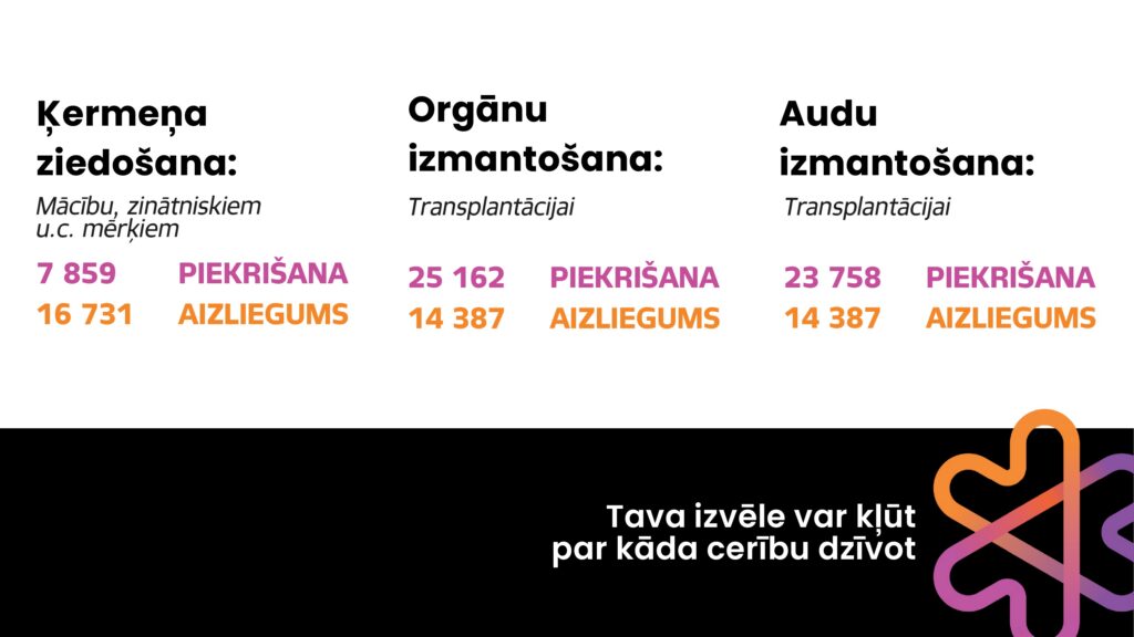 Līdz šī gada oktobrim atzīmi par atļauju vai aizliegumu par orgānu ziedošanu transplantēšanas nolūkam kopumā ir veikuši 39 549 iedzīvotāji, 65 % no tiem sniedzot savu piekrišanu. Izvēli par audu ziedošanu pēc nāves veikuši 38 145 iedzīvotāji, no kuriem 62% snieguši piekrišanu audu tālākai izmantošanai. Savukārt atzīmi par atļauju vai aizliegumu izmantot ķermeni mācību vai zinātniskiem mērķiem u.c. veikuši 24 590 iedzīvotāji, no kuriem vien trešdaļa devusi piekrišanu.