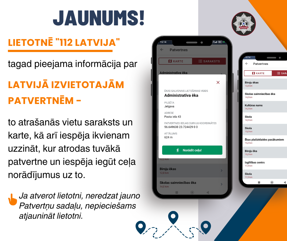 Aicinām iedzīvotājus, kuri vēl nav lejupielādējuši lietotni “112 Latvija”, to izdarīt, savukārt esošos lietotājus – atjaunināt lietotni, lai piekļūtu jaunākajai informācijai un funkcijām.