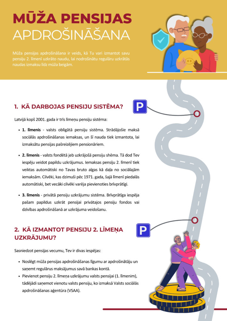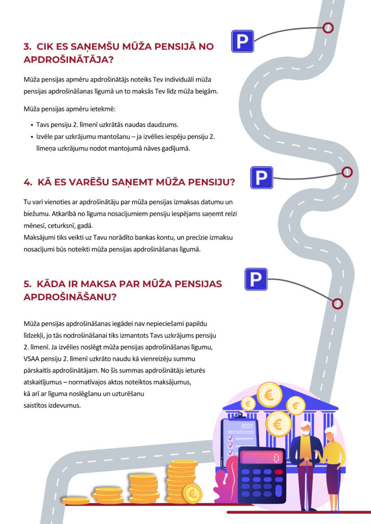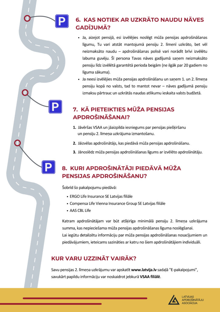 Turpinot izglītojošo kampaņu par dažādiem apdrošināšanas veidiem, LAA kopā ar sadarbības partneriem ir sagatavojusi mūža pensijas apdrošināšanas ceļa karti. Tajā vienkāršā valodā skaidrota mūža pensijas apdrošināšanas darbība, izmantojot ceļa kartes principu, t. sk. kā pieteikties mūža pensijas apdrošināšanai, kā to varēs saņemt un cik par to jāmaksā.