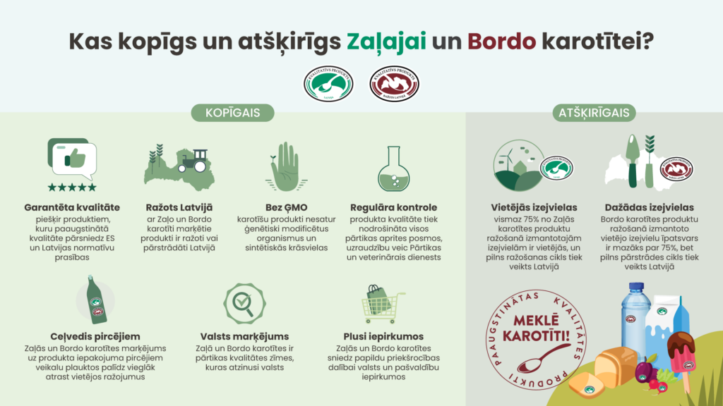 Zaļā un Bordo karotīte ir kvalitātes zīmes, kuras patērētājiem sniedz pārliecību par produkta izcelsmi un kvalitāti. Produkti ar karotītes zīmēm ir ražoti Latvijā, un tiem ir augsta kvalitāte, kuras ievērošana tiek stingri uzraudzīta.