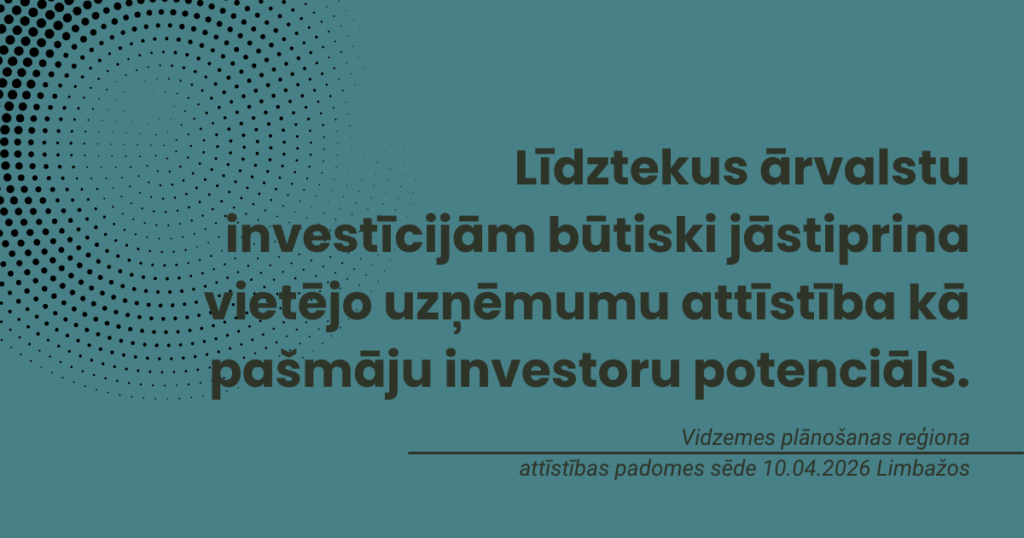 Lai uzlabotu investīciju piesaisti reģionos, nepieciešama ciešāka un sistemātiskāka sadarbība starp valsts institūcijām un pašvaldībām, kā arī skaidrāka informācijas aprite par investīciju projektiem – šāds secinājums izskanēja Vidzemes plānošanas reģiona (VPR) Attīstības padomes sēdē, kas 2026. gada 10. aprīlī notika Limbažos, piedaloties Ekonomikas ministrijas un Latvijas Investīciju un attīstības aģentūras pārstāvjiem.