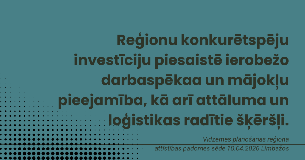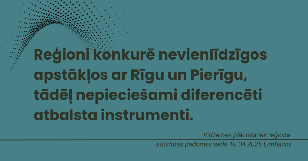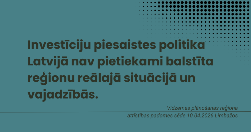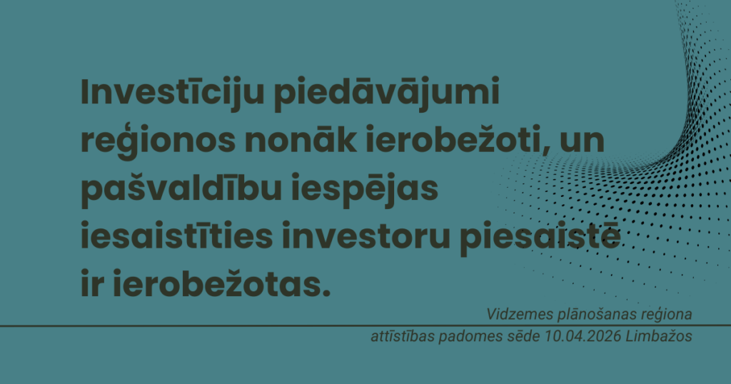 Vidzemes pašvaldību pārstāvji norādīja, ka investīciju piesaistes politika Latvijā nav pietiekami balstīta reģionu reālajā situācijā un vajadzībās. Reģioni šobrīd konkurē nevienlīdzīgos apstākļos ar Rīgu un Pierīgu, tādēļ nepieciešami mērķēti atbalsta instrumenti, kas ņem vērā katras teritorijas attīstības profilu un risina darbaspēka un mājokļu pieejamības, kā arī attāluma un loģistikas radītos ierobežojumus.