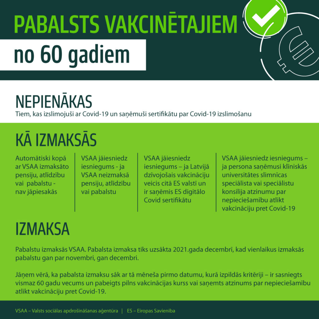 Valsts sociālās apdrošināšanas aģentūra (VSAA) par laikposmu no 2021.gada 1.novembra līdz 2022.gada 31.martam izmaksās 20 eiro pabalstu mēnesī Latvijā dzīvojošām personām, kuras līdz 2021.gada 31.decembrim ir sasniegušas 60 gadu vecumu un: