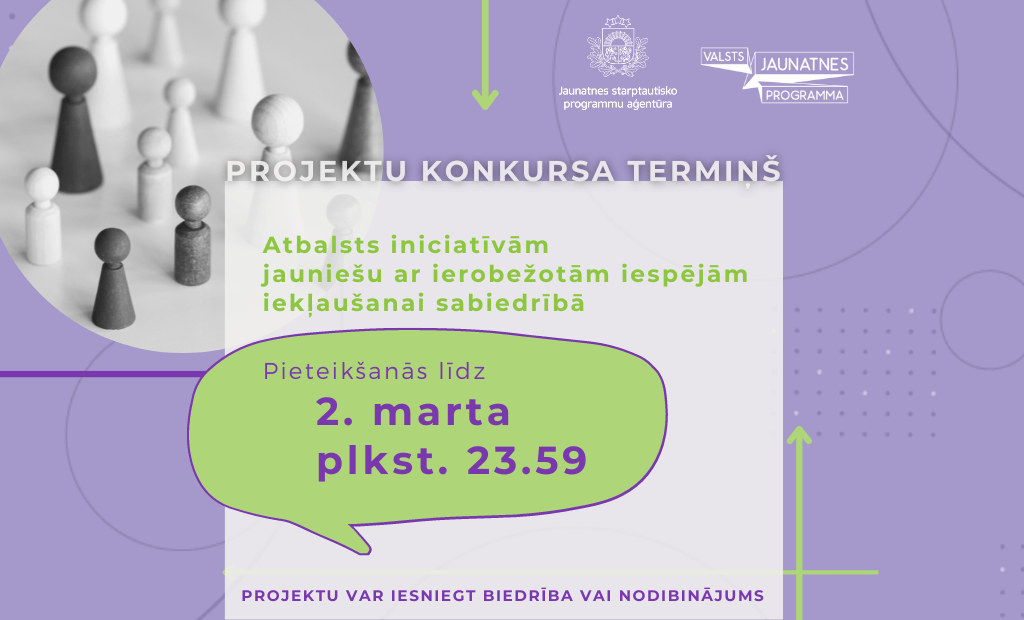 Jaunatnes starptautisko programmu aģentūra (JSPA) Izglītības un zinātnes ministrijas Jaunatnes politikas valsts programmas 2023.-2025. gadam ietvaros izsludina atklāto projektu konkursu “Atbalsts iniciatīvām jauniešu ar ierobežotām iespējām iekļaušanai sabiedrībā”. Projektu pieteikumus finansējuma saņemšanai var iesniegt NVO (biedrības un nodibinājumi) līdz 2023. gada 2. marta plkst. 23.59. Konkursā kopējais pieejamais finansējums no valsts budžeta līdzekļiem ir 231 000 eiro.