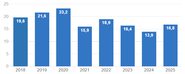 | 25–34 | 18,7 | 18,6 | 18,8 | 15,5 | 16,1 | 13,5 | 11,6 | 12,8 |