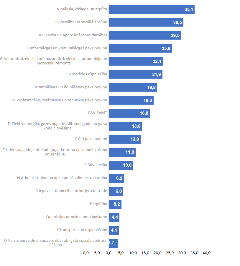 Savukārt visaugstākā darba samaksas atšķirība sievietēm un vīriešiem bija mākslas, izklaides un atpūtas nozarē (35,1 %), veselības un sociālās aprūpes nozarē (30,5 %), finanšu un apdrošināšanas darbību jomā (29,5 %), kā arī informācijas un komunikācijas pakalpojumu nozarē (25,8 %).