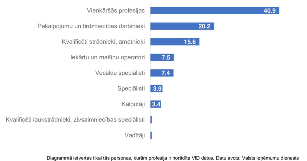40,9 % nodarbināto strādā vienkāršajās profesijās, kā biroju, viesnīcu un citu telpu apkopēji, virtuves strādnieki, preču izvietotāji un citi. 20,2 % ir pakalpojumu un tirdzniecības darbinieki, 15,6 % ir kvalificēti strādnieki un amatnieki, bet 0,5 % – vadītāji.