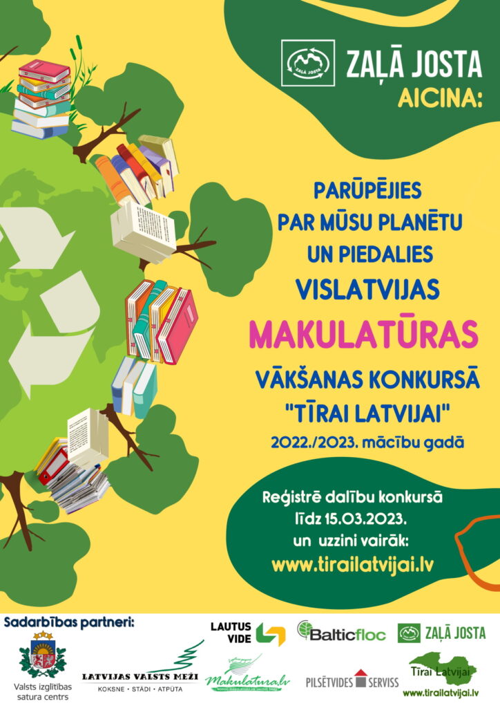 Makulatūras vākšanas kampaņu “Tīrai Latvijai!” organizē “Zaļā josta” sadarbībā ar Valsts izglītības satura centru, SIA “Līgatnes papīrs”, SIA “Balticfloc”, AS “Latvijas valsts meži”, SIA “Pilsētvides serviss”, PS “LAUTUS VIDE”.