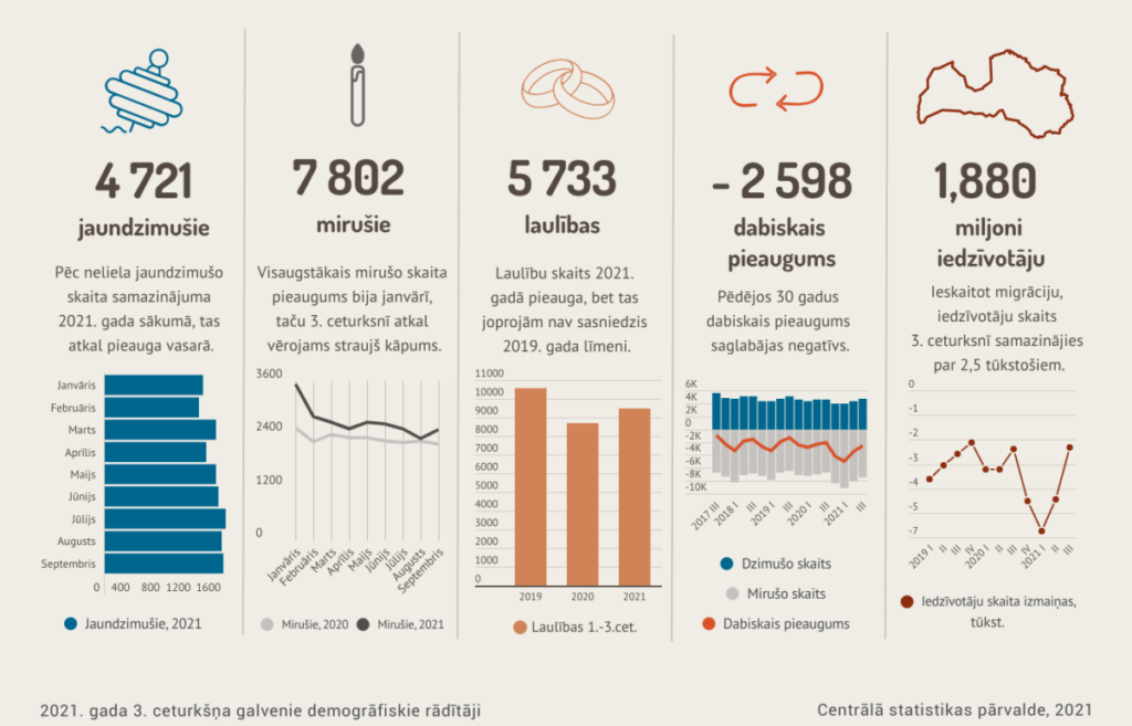 Šogad līdz septembrim Latvijā reģistrēti 24 103 mirušie, kas ir par 3,5 tūkstošiem jeb 17 % vairāk nekā pagājušā gada deviņos mēnešos. Covid-19 pandēmija izraisīja mirstības pieaugumu, un šogad mirušo skaits katru mēnesi pārsniedza pagājušā gada attiecīgo mēnešu rādītājus.