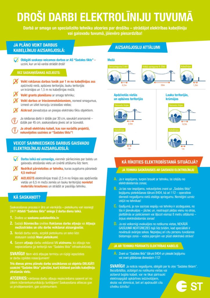 Visa būtiskākā informācija par aizsargjoslu platumu, darbu saskaņošanu, drošības prasībām un rīcību elektrotīkla bojājuma gadījumā, pieejama plakātā, ko var lejupielādēt “Sadales tīkla” mājaslapā. Gan plakāts, gan pareizas evakuācijas instrukciju video ir brīvi pieejami ikvienam. Būvniecības, lauksaimniecības un citu pakalpojumu sniedzēji, specializētās tehnikas pārdevēji un nomas pakalpojumu sniedzēji aicināti šos materiālus izmantot darbinieku informēšanai.