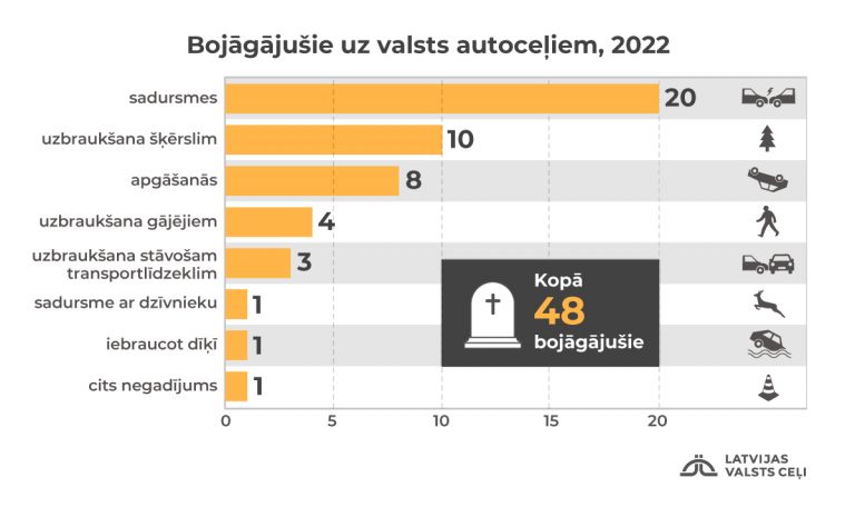 No 48 šogad bojāgājušajiem uz valsts autoceļiem 20 gāja bojā sadursmēs, astoņi – auto apgāšanās rezultātā, viens gāja bojā sadursmē ar dzīvnieku, četri bojāgājušie bija gājēji, desmit gāja bojā uzbraukšanā šķērslim, trīs – uzbraukšanā stāvošam transporta līdzeklim. Viens cilvēks zaudējis dzīvību, transportlīdzeklim iebraucot dīķī, bet vēl viens bojāgājušais miris citos apstākļos.