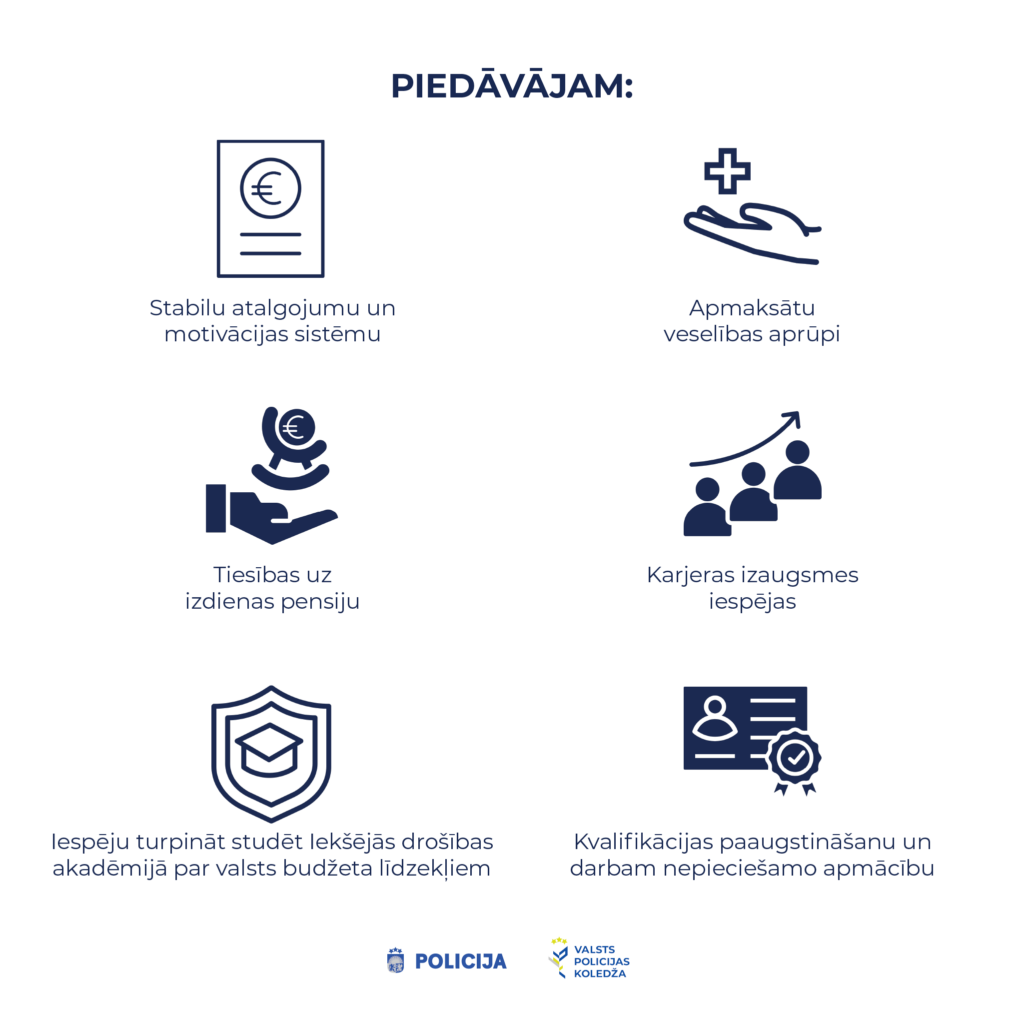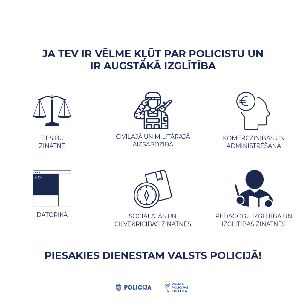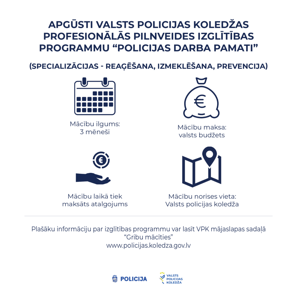 Vienlaikus varat jau ielūkoties aktuālo vakanču sadaļā Valsts policijas mājas lapā: https://www.vp.gov.lv/lv/vakances un uzzināt vairāk par konkrēto studiju programmu Valsts policijas koledžas mājas lapā: https://www.policijas.koledza.gov.lv/lv/profesionalas-pilnveides-izglitibas-programma-policijas-darba-pamati-0
