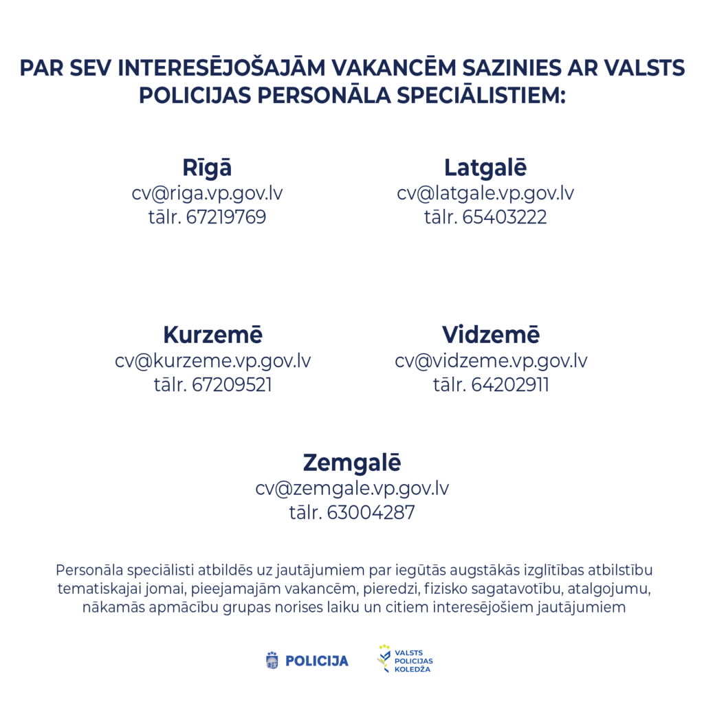 Gadījumā, ja kādā no šīm dienām tomēr nav iespējas ierasties klātienē, aicinām sazināties ar Valsts policijas personāla speciālistiem par sev interesējošām vakancēm, nepieciešamo izglītību un pieredzi, fizisko sagatavotību, atalgojumu, nākamās mācību grupas norises laiku un citiem jautājumiem, rakstot e-pastu vai zvanot attiecīgā reģiona speciālistam:
