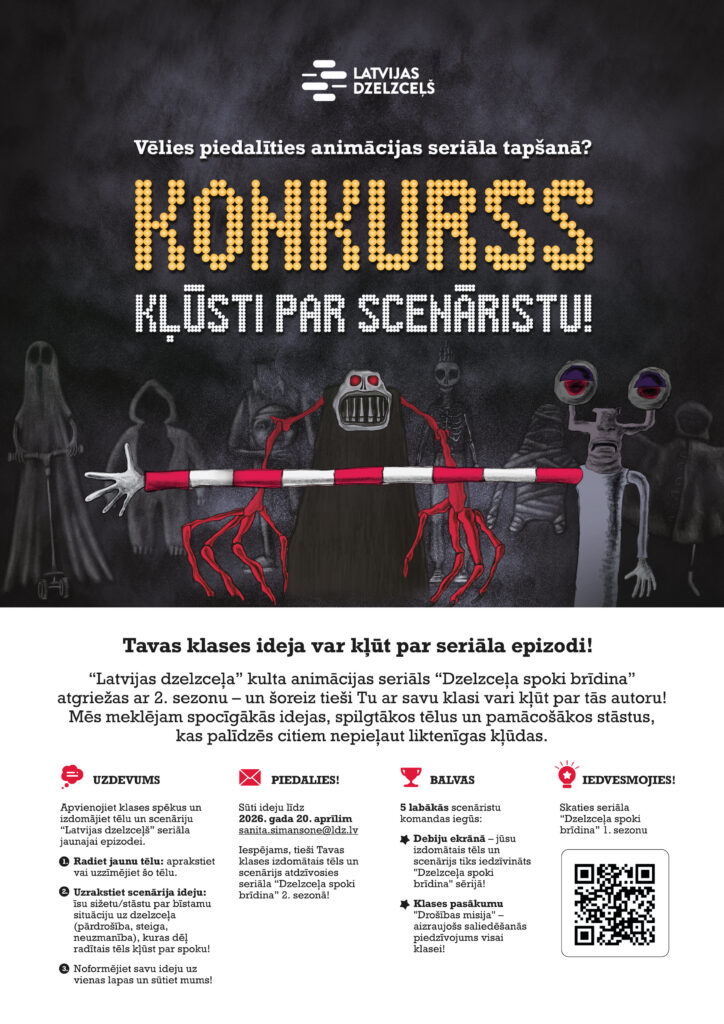 Lai veicinātu izpratni par drošu uzvedību dzelzceļa sliežu tuvumā, VAS “Latvijas dzelzceļš” (LDz) aicina skolēnus piedalīties radošā konkursā un kļūt par animācijas seriāla “Dzelzceļa spoki brīdina” otrās sezonas veidotājiem, radot jaunus tēlus un scenāriju idejas.