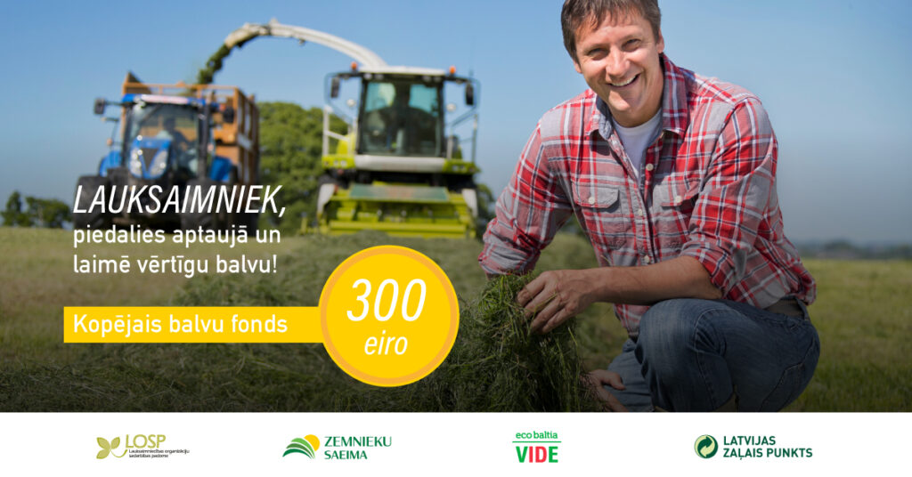 Lai uzzinātu lauksaimnieku viedokli un noskaidrotu situāciju saistībā par lauksaimniecībā izmantotā iepakojuma apsaimniekošanu, definētu galvenos problēmjautājumus, kas palīdzētu veicināt iepakojuma savākšanu un pārstrādi Latvijā, biedrība “Zemnieku saeima” (ZSA), biedrība “Lauksaimnieku organizāciju sadarbības padome” (LOSP) sadarbībā ar vides apsaimniekošanas uzņēmumu SIA “Eco Baltia vide” un Latvijas Zaļo punktu no šī gada 8.decembra līdz 2022.gada 24.janvārim aicina lauksaimniekus piedalīties aptaujā.