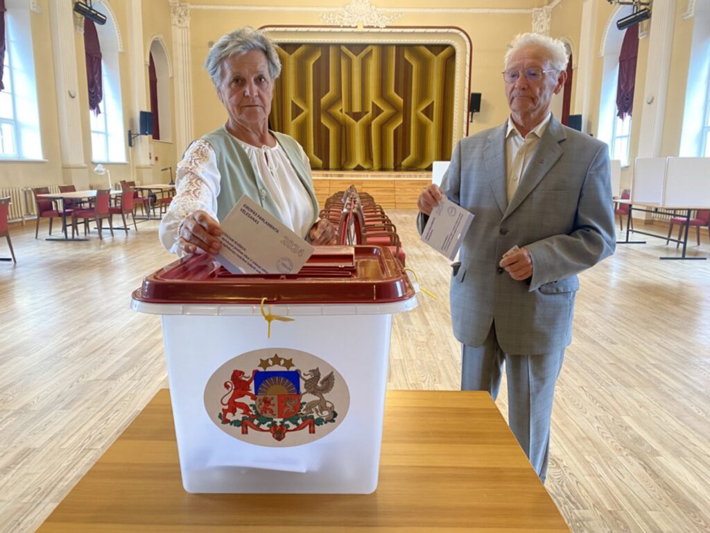 Ceturtdien īsi pēc pulksten 16, kad durvis vēra vēlēšanu iecirknis Valkas kultūras namā, savas balsstiesības Eiropas Parlamenta vēlēšanās izmantoja Valkas novadā cienījama ğimene – Dzidra un Kārlis Albergi. Šajā dienā, kas bijusi tikpat saulaina un mākoņaina, pirms 54 gadiem Dzidra un Kārlis viens otram teica “jā” vārdu. Savā svētku dienā saposušies un devušies arī novēlēt. FOTO: INGA KARPOVA