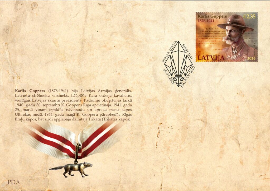 VAS “Latvijas Pasts” izdos pastmarku un īpašā dizaina aploksni, kas veltīta Latvijas Bruņoto spēku ģenerālim un vienīgajam Latvijas Skautu prezidentam Kārlim Gopperam viņa 150. gadadienā. Filatēlijas izdevumi būs pieejami no 9. aprīļa.