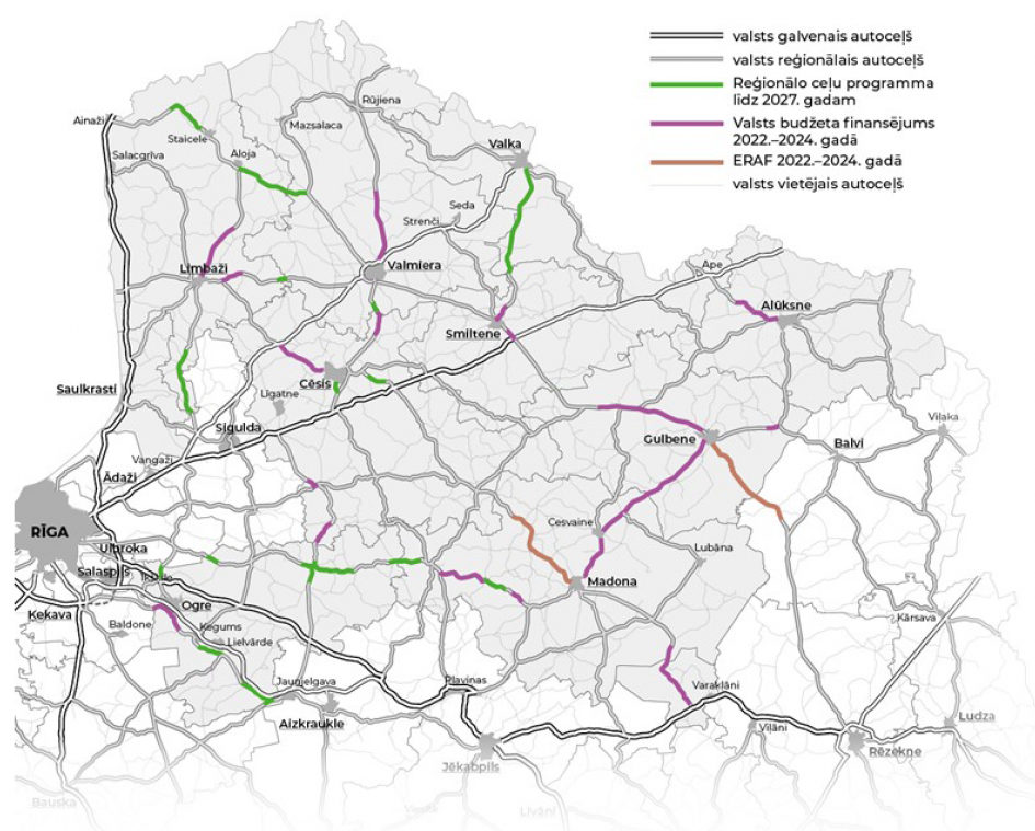 Starp prioritāri atjaunojamiem valsts reģionālo autoceļu posmiem Vidzemē, kur būvdarbus plānots uzsākt jau 2022. gadā, piemēram, ir uz autoceļa P27 Smiltene–Gulbene, kur plānots atjaunot ceļa posmu 25 km garumā līdz Gulbenei (km 34,85-61,15), uz autoceļa P37 posmā no Madonas līdz Gulbenei (km 42,76-60,14) un uz autoceļa P24 Smiltene–Valka 27 kilometru garam posmam līdz Valkai (km 15,38-42,00).