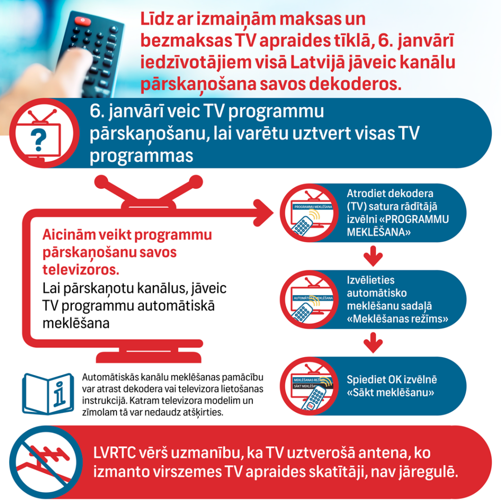 Līdz ar Nacionālās elektronisko plašsaziņas līdzekļu padomes (turpmāk – NEPLP) lēmumu par to, ka no nākamā gada bezmaksas zemes TV apraidē tiks pārraidītas piecas TV programmas, VAS Latvijas Valsts radio un televīzijas centrs (turpmāk – LVRTC) naktī no 5. uz 6. janvāri veiks izmaiņas TV apraides tīklā. Tā rezultātā gan maksas, gan bezmaksas TV apraides skatītājiem ir jāveic kanālu pārskaņošana savos dekoderos. Ja programmu pārskaņošana netiks veikta, bezmaksas apraidē esošās programmas skatītājiem nebūs redzamas. Pēc pārskaņošanas LTV1 un LTV7 programmas skatītājiem būs redzamas arī HD kvalitātē.