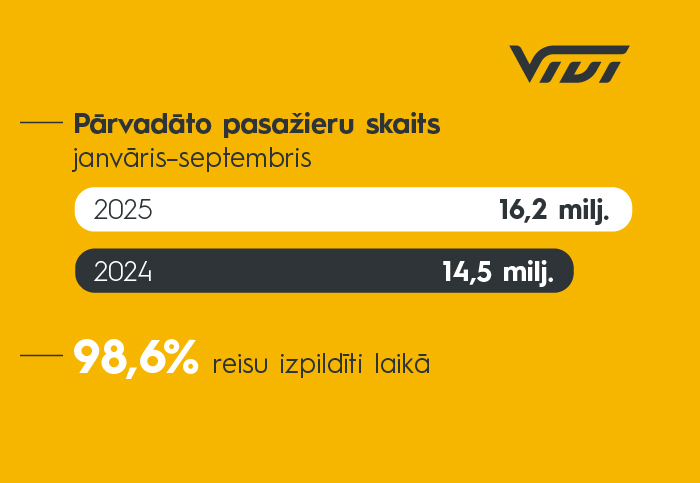 2025. gada pirmajos deviņos mēnešos vilciena pasažieru pārvadātāja Vivi pakalpojumus izmantojuši 16,2 miljoni pasažieru – tas ir par 1,7 miljoniem jeb 11% vairāk nekā attiecīgajā periodā pērn, kad tika pārvadāti 14,5 miljoni pasažieru. Vienlaikus vilcienu precizitāte – rādītājs, kas atspoguļo reisu izpildi atbilstoši kustības grafikam – šajā periodā bija 98,6 %, saglabājot Vivi pozīcijas starp precīzākajiem vilciena pasažieru pārvadātājiem Eiropā.