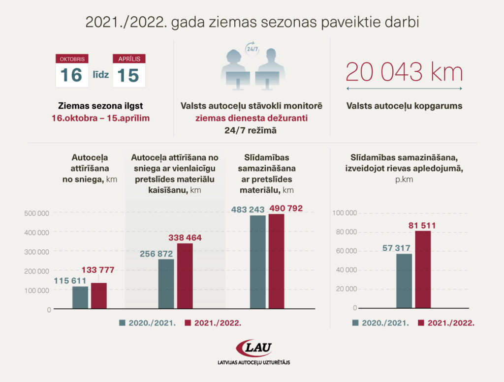 Lai samazinātu brauktuvju slīdamību un nodrošinātu drošākus braukšanas apstākļus autovadītājiem, šajā ziemas sezonā brauktuvju apstrāde ar pretslīdes materiāliem veikta vairāk nekā 490 000 km garumā, autoceļu attīrīšana no sniega ar  vienlaicīgu pretslīdes materiālu kaisīšanu 338  400  km, autoceļu attīrīšana no sniega veikta vairāk nekā 133 700 km un rievu izveide uz autoceļiem ar sniega vai ledus kārtu, kas sasniedz vismaz piecus centimetrus, tika veikta vairāk nekā 81 500 pārgājiena km garumā.