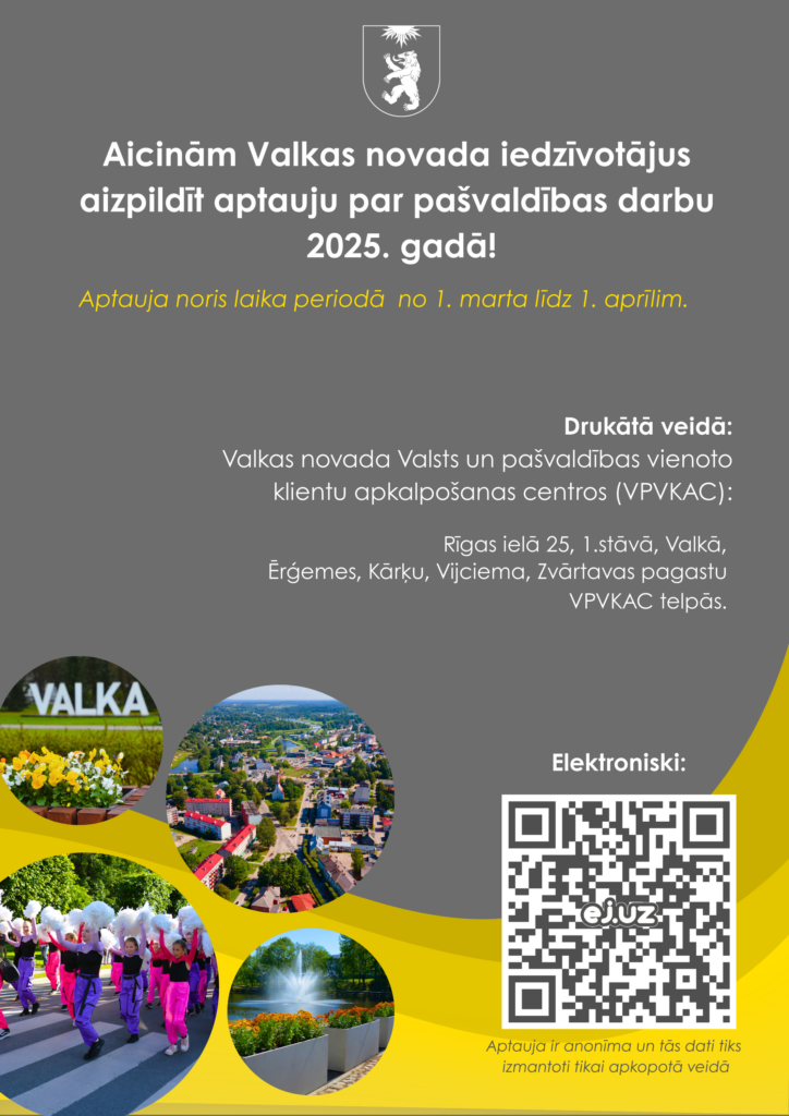Valkas novada pašvaldība aicina iedzīvotājus piedalīties aptaujā, sniedzot savu vērtējumu par pašvaldības pakalpojumu pieejamību un kvalitāti 2025. gadā, kā arī paužot viedokli par Valkas novadā līdz šim paveikto un darbiem, kam turpmāk būtu pievēršama īpaša uzmanība.