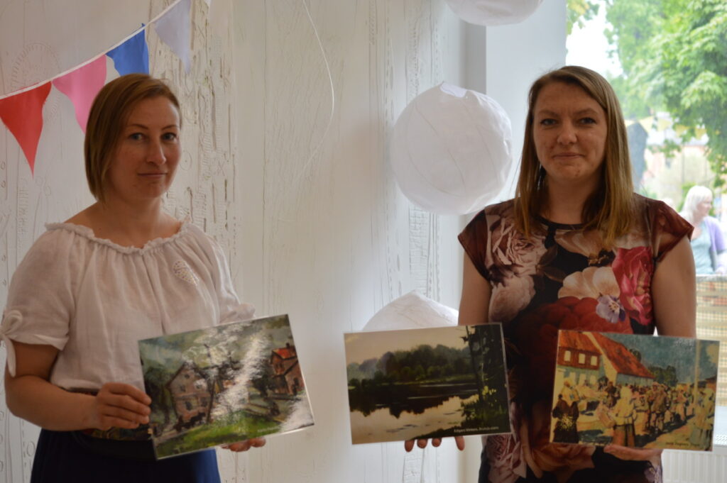 Smiltenes novada muzeju pārstāvēja Ieva Miķe (no labās) un Zane Bērza, piedāvājot arī salikt jaunās puzles – Smiltenes gleznu reprodukcijas. Foto: Sandra Pētersone
