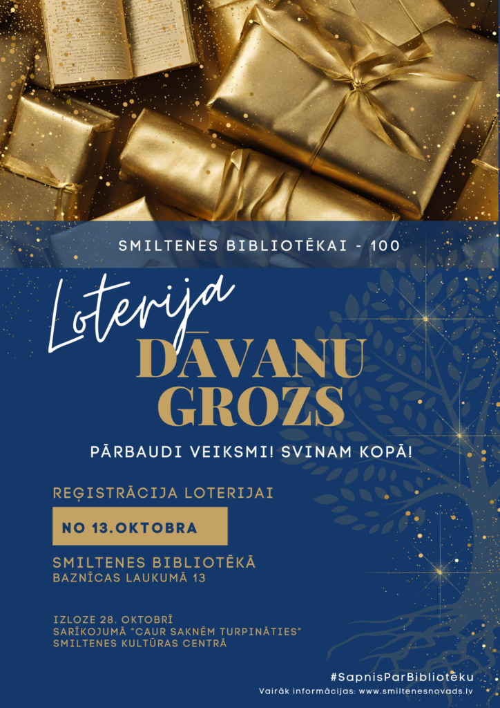 Smiltenes bibliotēkas apmeklētāji no 13.oktobra aicināti reģistrēties loterijai “Dāvanu grozs”, aizpildot loterijas biļeti. Biļetes pieejamas Smiltenes bibliotēkas abonementā, Baznīcas laukumā 13. Izloze notiks bibliotēkas simtgades svinīgajā sarīkojumā “Caur saknēm turpināties” Smiltenes Kultūras centrā 28.oktobrī, sākums pl.14.00.
