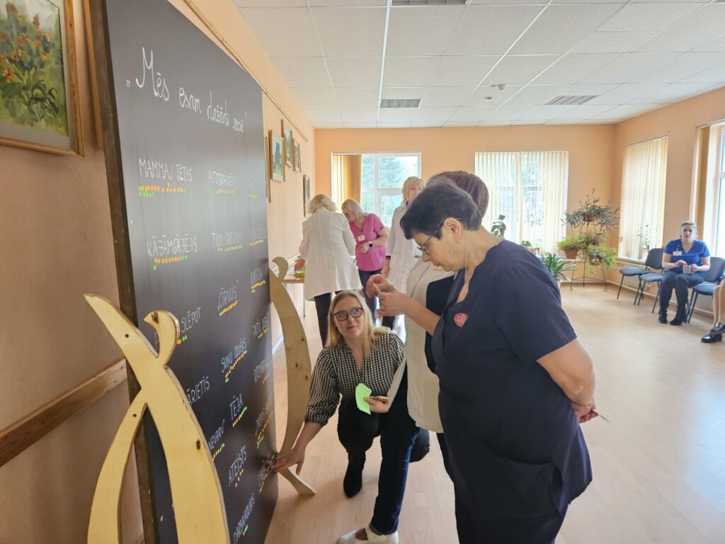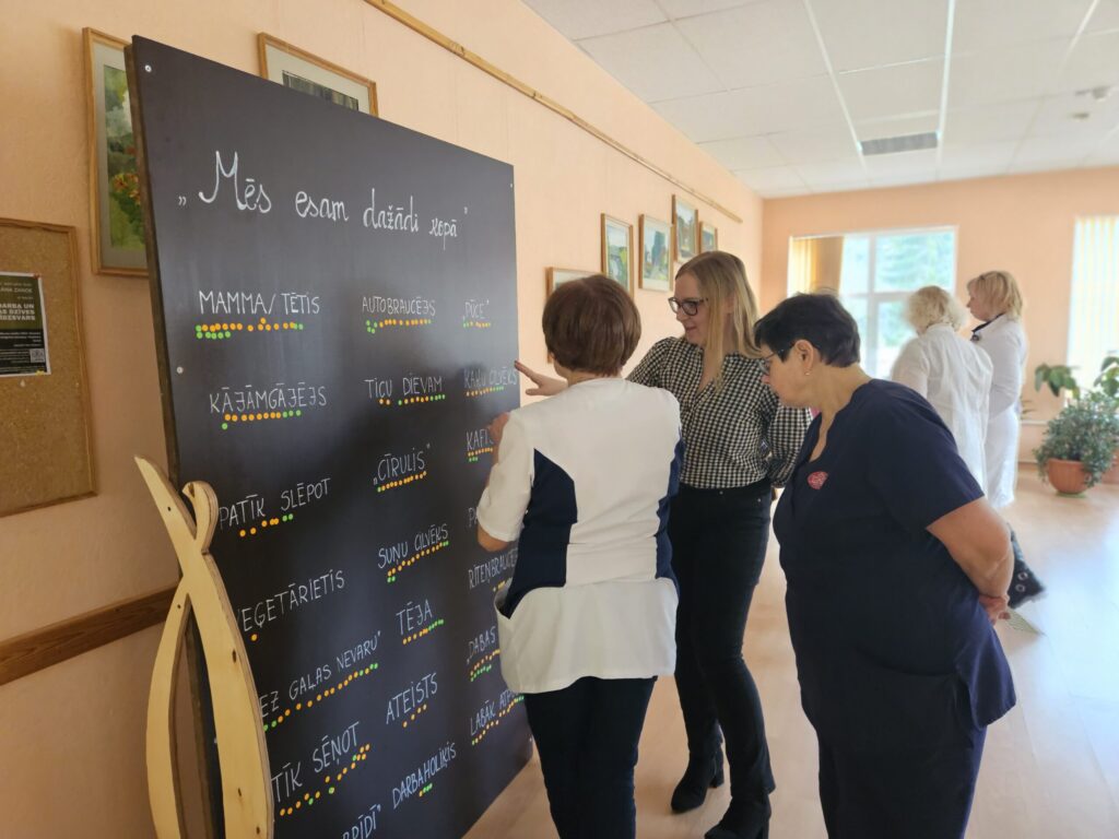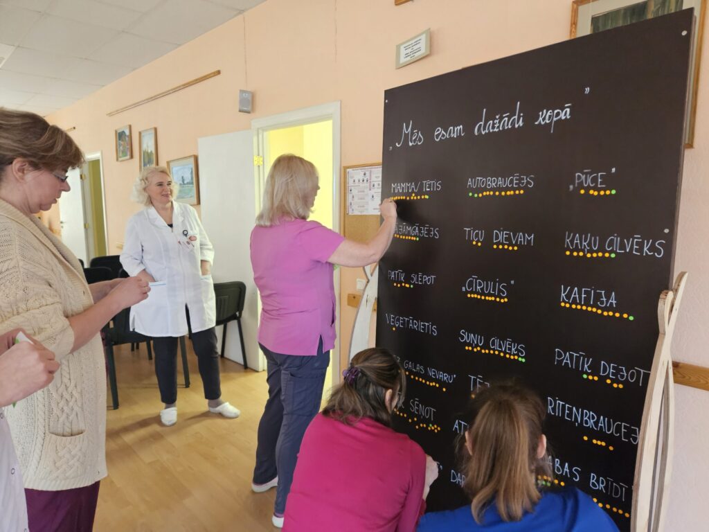 Sākumā dalībnieki iesaistījās un veidoja īpašu tāfeli “Mēs esam dažādi kopā”, kurā šobrīd iespējams saskatīt Slimnīcas darbinieku dažādību caur paradumu, interešu un personību raksturojošiem elementiem. Turpinājumā sekoja prezentācija par dažādības jēdzieniem, mērījumiem un personības apli kurā uzskatāmi var apskatīt visas dažādības šķautnes, kā arī par dažādības vadības ceļu Slimnīcā.