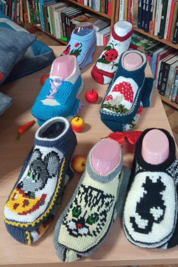 “Rudenī bibliotēkā bija manis adīto čību izstāde. Tās es veidoju košas un interesantas, ar dažādiem attēliem. Lai panāktu vēlamo rezultātu, ne tikai adu, bet arī izmantoju tunēziskās tamborēšanas elementus, lai uz čībiņām uzburtu ziedu vai kāda dzīvnieciņa tēlu. Iedzīvotāji sāka interesēties, kā top šādas čībiņas. Kāpēc gan nevarētu ar citiem padalīties ar to, ko pati daru? Tā vārds pa vārdam, kopā ar bibliotēkas vadītāju Aiju Ciguzi nolēmām, ka varbūt varētu piedāvāt tiem, kas vēlas, kādas radošās darbnīcas, kur būtu iespēja apgūt šīs prasmes. Man jau sen bija sapnis par šādu kopā sanākšanu un radošu darbošanos jaukā kompānijā,” atklāj D. Pogule.