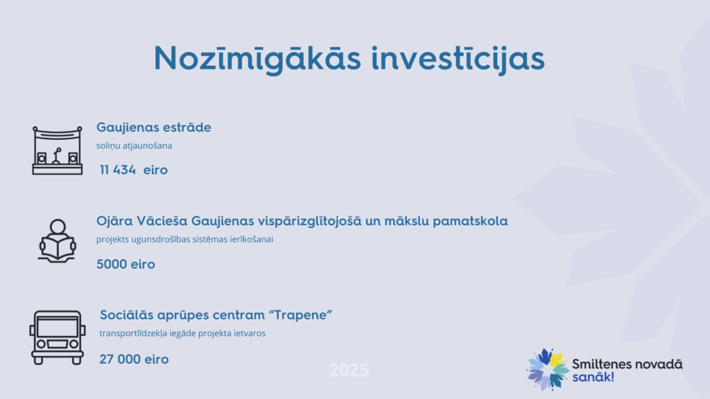 Pēc 2025. gada pašvaldības budžeta pieņemšanas aizsākām rakstu sēriju, informējot iedzīvotājus par nozīmīgākajām plānotajām investīcijām novada pilsētās un pagastos. Noslēdzot sēriju, stāstām par Gaujienas un Trapenes pagastiem, kuros plānoti labiekārtošanas un saimnieciskie remonti, kas veicinās iedzīvotāju dzīves kvalitāti un vides ilgtspējību.