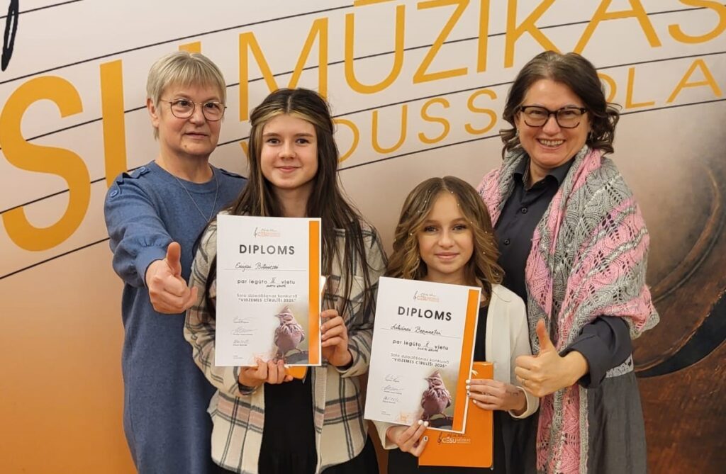 Solo dziedāšanas konkursā “Vidzemes cīrulīši” Enija Bitniece (otrā no kreisās) un Liliāna Bernarte savā grupā ieguva 2. vietu. Konkursā viņas atbalstīja skolotāja Inese Lečmane (pirmā no kreisās) un koncertmeistare Ilze Dāve.