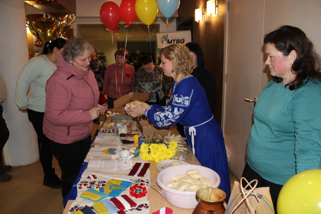 Smiltenes novada Ukrainas civiliedzīvotāju kopienas koordinatore Natālija Juščenko (vidū) teic paldies visiem ziedotājiem, arī palsmanietei Birutei Mežalei (no kreisās), kuri sestdien, 24. februārī, atbalstīja Ukrainas karavīrus, iesaistoties Smiltenes kultūras centrā sarīkotajā akcijā “Dāsnā sirds” un par ziedojumiem iegādājoties ukraiņu nacionālos gardumus un rokdarbus. FOTO: SANDRA PĒTERSONE
