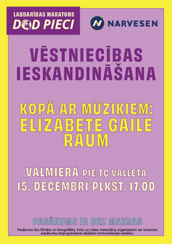 Aicinot ikvienu piedalīties labdarības maratonā “Dod pieci!”, 15. decembrī plkst. 17.00 pie TC “Valleta” tiks ieskandināta “Dod pieci!” Valmieras vēstniecība. Pasākumā uzstāsies mūziķi Elizabete Gaile un RAUM.