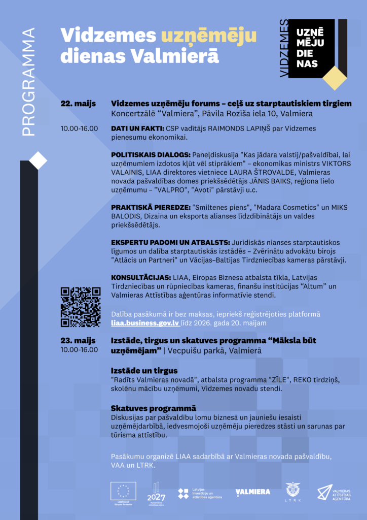 Valmiera gatavojas vienam no nozīmīgākajiem reģiona biznesa notikumiem – “Vidzemes uzņēmēju dienām 2026”, kas norisināsies 22. un 23. maijā. Pasākums piedāvās plašu programmu, kas ietver gan stratēģisku biznesa forumu par eksporta attīstību, gan iedvesmojošu pilsētvides notikumu “Māksla būt uzņēmējam”.
