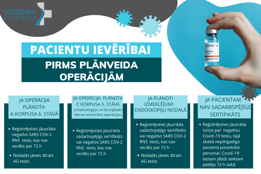 Lai varētu veikt oftalmoloģiskās un ķirurģiskās operācijas dienas stacionārā, reģistrējoties pacientam jāuzrāda derīgs sadarbspējīgs sertifikāts vai negatīvs SARS COV-2 RNS tests, kas nav vecāks par 72 stundām.