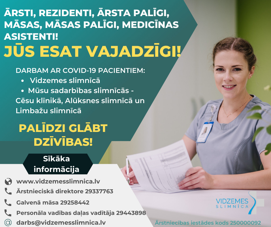 Mēs vēršamies pie visiem un katra, kas studējis medicīnu un praktizējis ārstniecībā – jūs varat palīdzēt glābt dzīvības! Varbūt esi pensionēta māsa, varbūt pārkvalificējusies māsa, kuras darbavieta kosmētiskajā kabinetā šobrīd slēgta, varbūt topošais ārsts vai aptiekas darbinieks ar izpratni par pacientu aprūpi. Aicinām komandā palīgus ne tikai darbam Vidzemes slimnīcā Valmierā, bet arī mūsu sadarbības slimnīcās – Cēsu klīnikā, Limbažu slimnīcā un Alūksnes slimnīcā. Ar savu pieredzi un prasmi jūs esat ļoti, ļoti vajadzīgi!