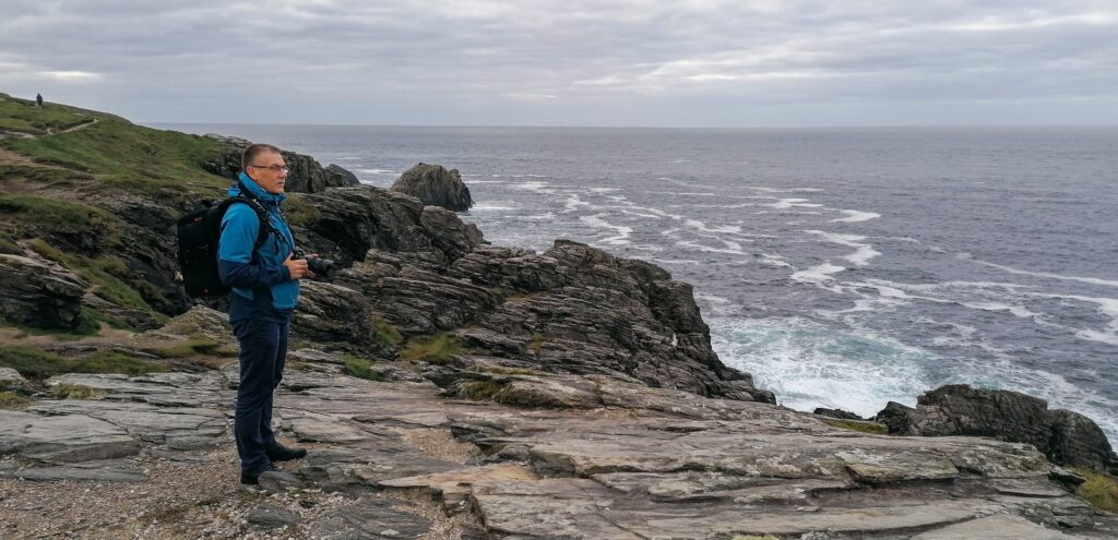 Par Jāni Ūdri var teikt “kurpnieks bez kurpēm”, jo foto arhīvā atrast fotogrāfiju, kurā iemūžināts viņš pats, ir grūtāk par grūtu. Jānis fotografē un filmē citus, pats paliekot aizkadrā. Retā fotogrāfija, kur Jānis foto “noķerts” Īrijā, lūkojot okeāna spēku. FOTO: NO J. ŪDRA PERSONĪGĀ ARHĪVA