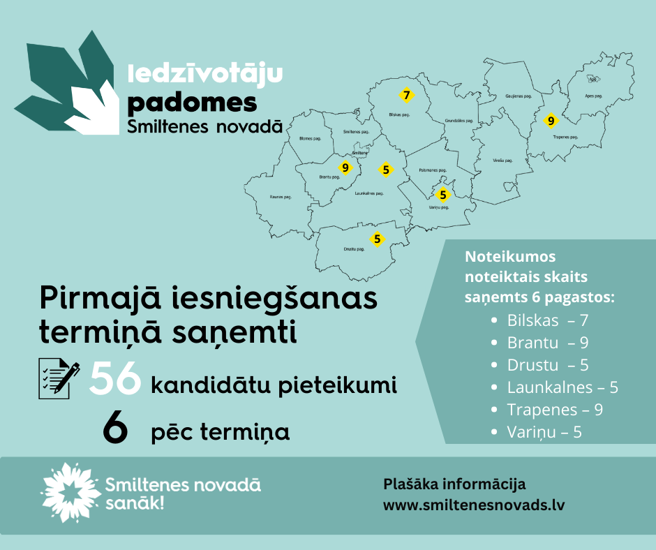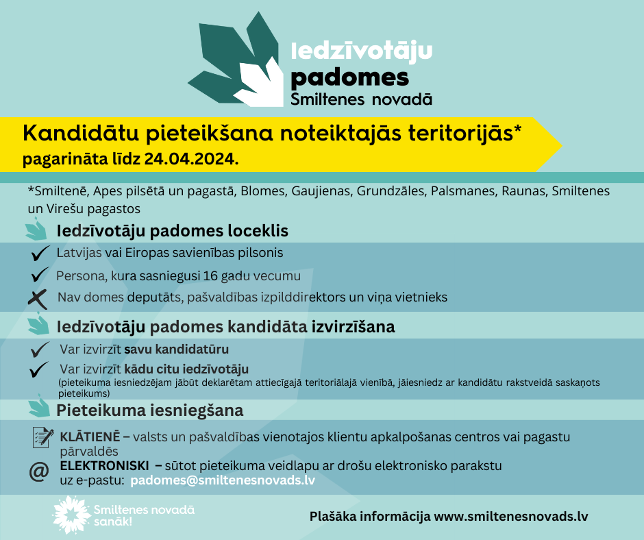 Līdz 24. aprīlim pieteikšanās iedzīvotāju padomēm izsludināta šādās novada administratīvajās teritorijās: Smiltenes pilsētā, Palsmanes, Virešu, Grundzāles, Gaujienas, Raunas, Blomes, Smiltenes pagastos, Apes pilsētā un pagastā. Visi iesniegtie kandidātu pieteikumi, kas saņemti šajās vietās pēc pirmā iesniegšanas termiņa, tiek pieņemti un nav atkārtoti jāiesniedz. Aicinām iedzīvotājus būt aktīviem un pieteikt savu kandidatūru vai ieteikt kādu citu darbam iedzīvotāju padomes sastāvā, lai uzsāktu padomes veidošanu. Pēc otrā termiņa noslēgšanās un datu apkopošanas pašvaldība maijā organizēs balsošanu par padomes kandidātiem.