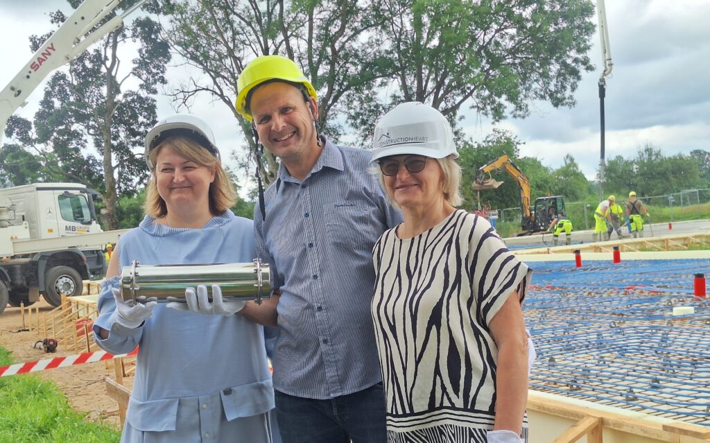 Šonedēļ ģimeniskai videi pietuvinātās senioru mājas “Rauna” jaunās ēkas pamatos tika ievietota laika kapsula ar vēstījumu nākamajām paaudzēm. Attēlā nodibinājuma “Raunas evaņģēliski luteriskās draudzes diakonijas centrs” padomes priekšsēdētājs Jānis Sīka un valdes locekles Evija Zurģe (no kreisās) un Anita Lubūze.