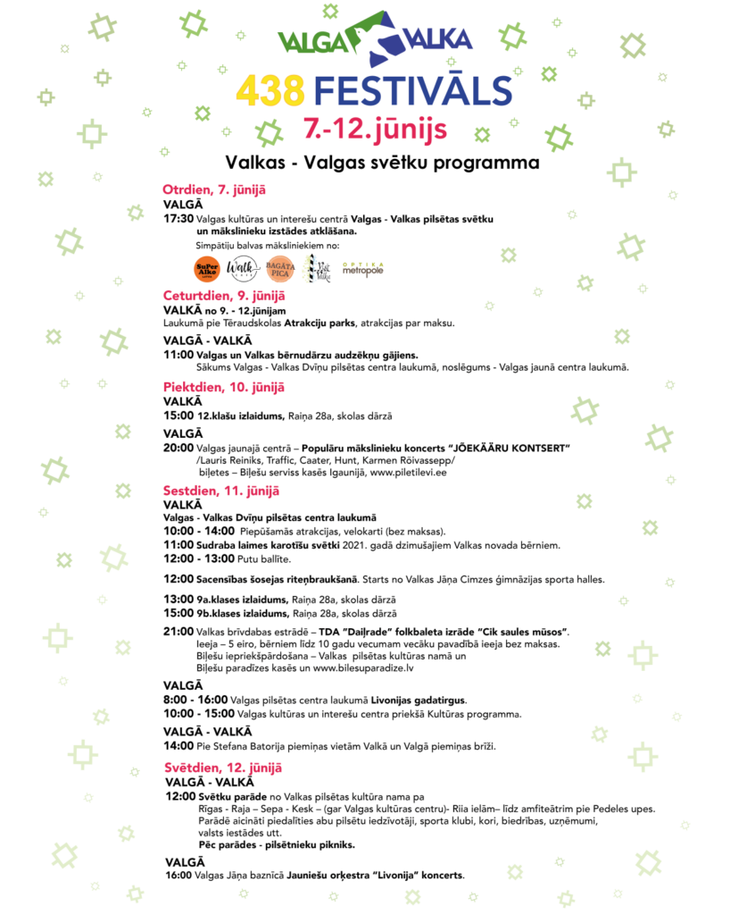 No 7. līdz 12. jūnijam norisināsies Dvīņu pilsētu Valkas – Valgas festivāls jeb pilsētu svētki par godu 438. gadadienai, kopš pilsētas tiesību piešķiršanas.