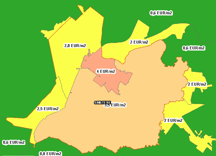 Savukārt, otrā NĪN aprēķina sastāvdaļa – kadastrālā vērtība, tiek aprēķināta izmantojot kadastrālo vērtību 2022. gada bāzes un kadastra informācijas sistēmā reģistrētos datus par kadastra objektu. Smiltenes pilsēta ir iedalīta divās vērtību zonās un tajās noteiktā 2022. gada bāzes vērtība individuālās apbūves zemei ir no 3,5 EUR/m2 līdz 4 EUR/m2, savukārt apkārtējos ciemos bāzes vērtība svārstās no 2 EUR/m2 līdz 2,8 EUR/m2.