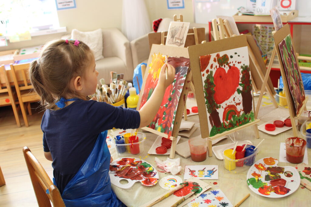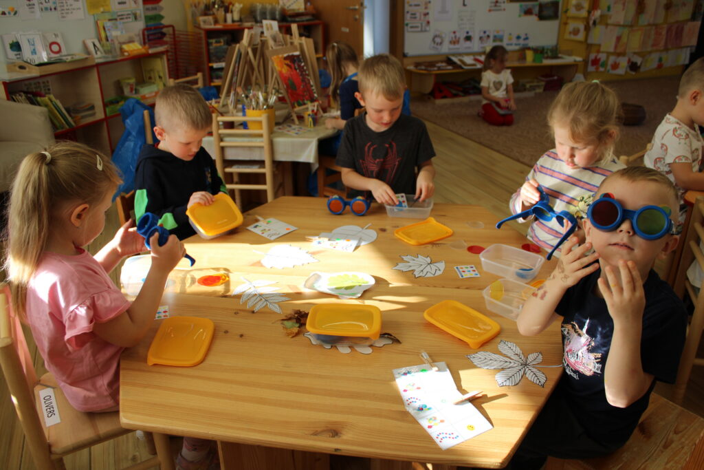 Piemēram, “Zilonēnu” grupiņas nodarbības tēma bija koki rudenī. Bērni jauca krāsas un gleznoja uz molberta, ar īpašām brillēm pētīja, kas notiek, saliekot kopā divas krāsas.