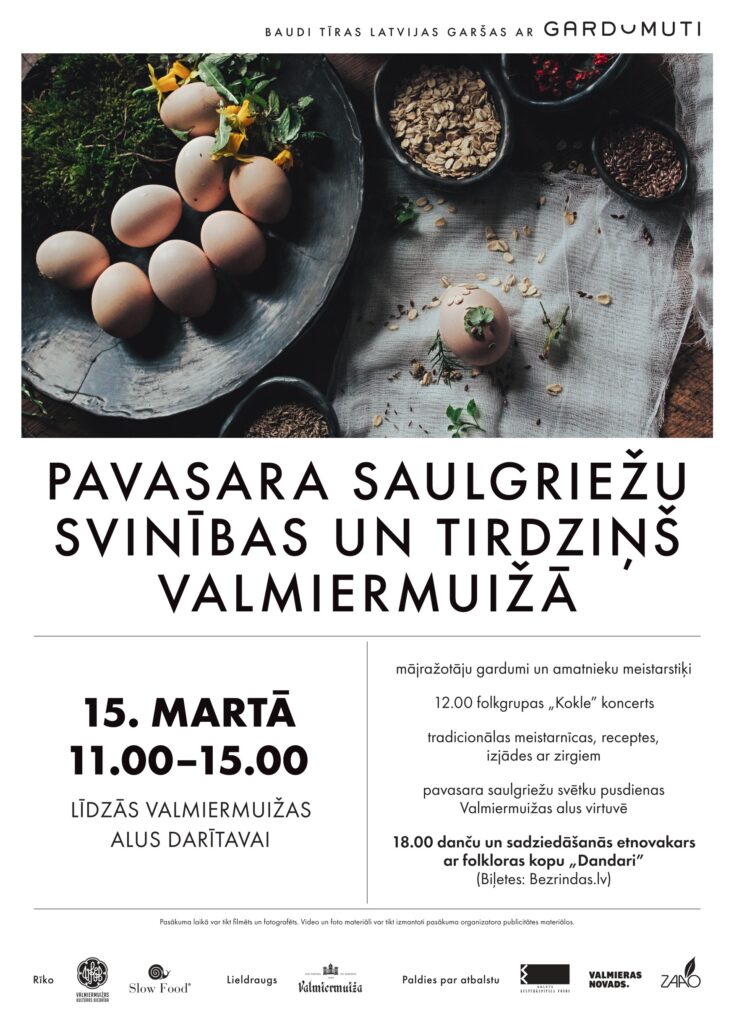 Pavasara saulgrieži iekrīt laikā, kad daba mostas un ir laiks smelties enerģiju un uzņemt dabas dotos vitamīnus. Valmiermuižā būs sabraukuši tirgotāji no visas Latvijas ar kvalitatīviem un latviskiem produktiem, lai pavasari ikkatrs varētu sagaidīt godam. Mājražotāji būs saveduši kārumus, svaigu sieru, gardu maizi un smeķīgu gaļu, savukārt amatnieki būs sarūpējuši pavasarīgus mājas dekorus, glaunas rotas un drānas.