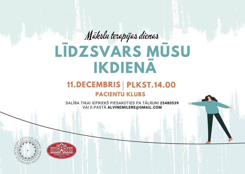 11. decembrī, plkst. 14.00 VSIA “Strenču psihoneiroloģiskā slimnīca” (turpmāk- Slimnīca) rehabilitācijas nodaļas mākslu terapeiti ielūdz ikvienu interesentu piedalīties mākslu terapijas dienu aktivitātē “Līdzsvars mūsu ikdienā”.