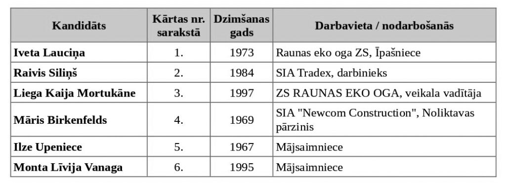 Ar pirmo numuru startē zemnieku saimniecības “Raunas eko oga” īpašniece Iveta Lauciņa. Pēc publiski pieejamās informācijas, viņa kandidēja 14. Saeimas vēlēšanās 2022. gadā partijas “Vienoti Latvijai” sarakstā. Šobrīd Iveta Lauciņa ir partijas “Apvienība Jaunlatvieši” biedre.