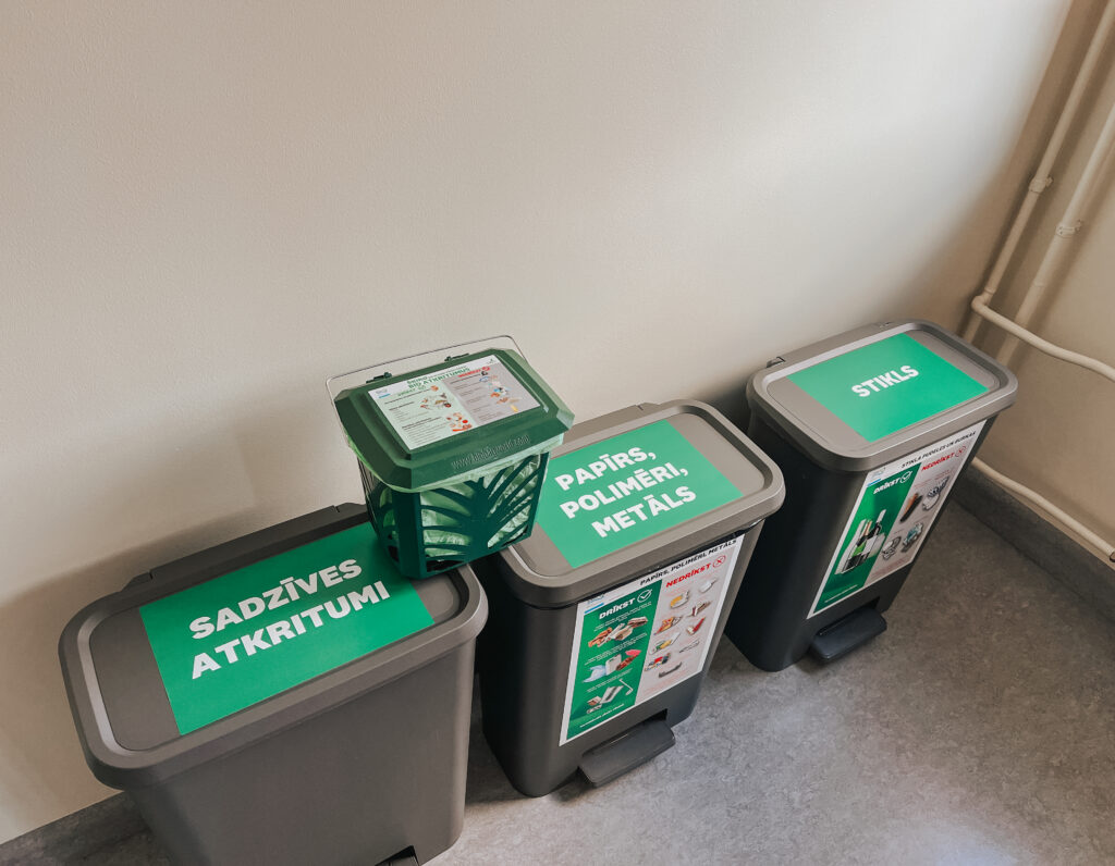 Lai nodrošinātu atkritumu šķirošanas iespēju, kā arī izmēģinātu bio atkritumu šķirošanu dienesta viesnīcās, kas pēc uzbūves ir līdzīgas daudzdzīvokļu mājām, projekta “Vides ilgtspējīga attīstība 2030: mācīšanās noturīgās un ilgtspējīgās pašvaldībās” ietvaros dienesta viesnīcās tika izvietotas tvertnes šķirotajiem bio atkritumiem. Lai atkritumu šķirošana būtu ērta, tika iegādātas nelielas, 6 litru tvertnes, lai maisiņi piepildītos regulāri un tos varētu mainīt katru vai katru otro dienu. Lai šķirotais materiāls būtu kvalitatīvs, īpaši svarīgi ir nodrošināt, ka nav plastmasas vai citu materiālu piejaukumi, tādēļ tika iegādāti bioloģiski noārdāmi atkritumu maisi.