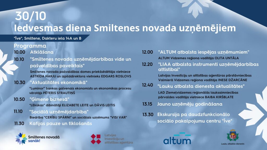 “Iedvesmas dienu” atklās Smiltenes novada pašvaldības domes priekšsēdētāja vietniece Astrīda Harju, par pašvaldības aktualitātēm, uzņēmējdarbības vidi un attīstības iecerēm novadā stāstīs izpilddirektora vietnieks Edgars Roslovs. Viņš iezīmēs pašvaldības prioritātes uzņēmējdarbības atbalstam, plānotos infrastruktūras un sadarbības projektus. Par situāciju ekonomikā un nākotnes tendencēm stāstīs “Luminor” bankas galvenais ekonomists Pēteris Strautiņš.