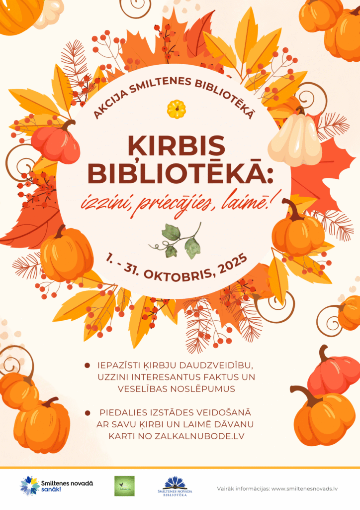 Oktobrī Smiltenes bibliotēkas Bērnu apkalpošanas nodaļā norisināsies akcija “Ķirbis bibliotēkā: izzini, priecājies, laimē!”. Aicinām ikvienu nest uz bibliotēku Gaujas ielā 1 neparastus un interesantus ķirbjus, lai kopā veidotu krāšņu ķirbju izstādi un iepazītu to daudzveidību.