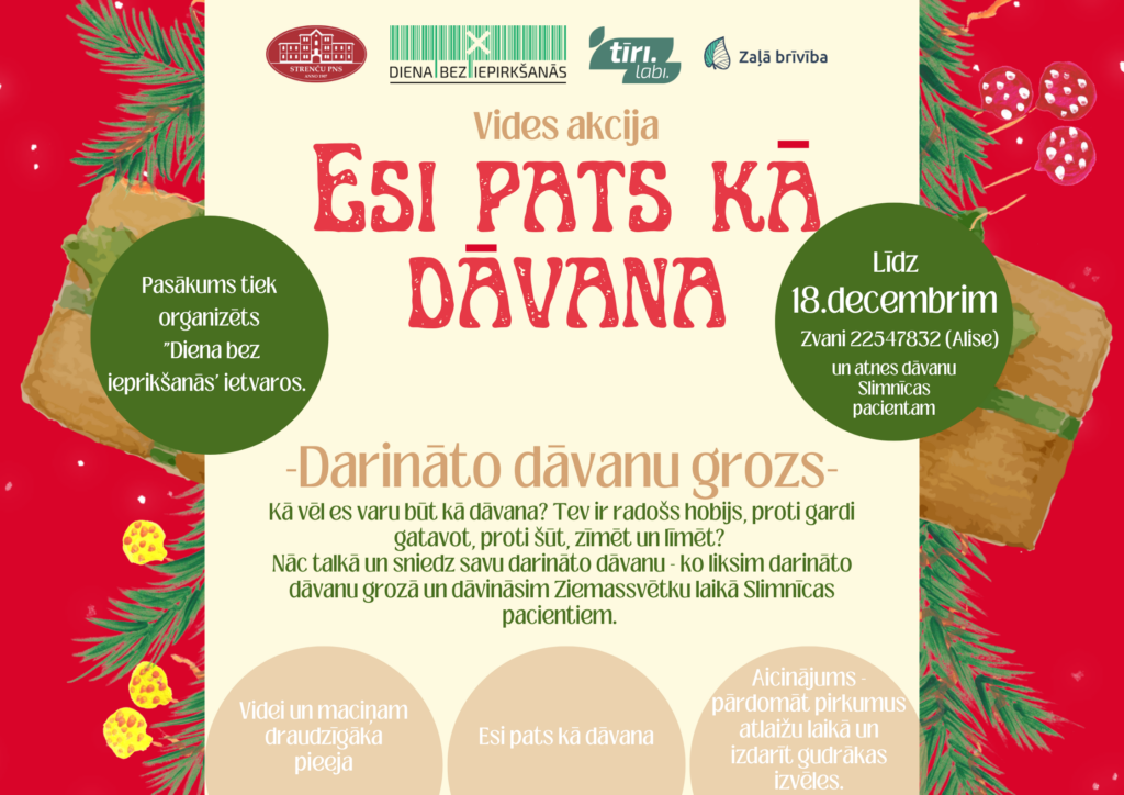 Aicinot apdomāt iepirkšanās paradumus, Slimnīca organizē vides akciju “Esi pats kā dāvana”. Tās ietvaros projektu vadītāja Ilona Rāviete un sabiedrisko attiecību speciāliste Alise Seile 6. decembrī organizēs Slimnīcas darbiniekiem meistarklasi videi draudzīgu dāvanu pagatavošanā. Vides akcijas aicinājums ir domāt par jēgpilnu dāvanu idejām, kas mazina nevajadzīgu iepirkšanos, rūpējas par maciņa finansiālo veselību un samīļo planētu Zemi, radot mazāk atkritumus.